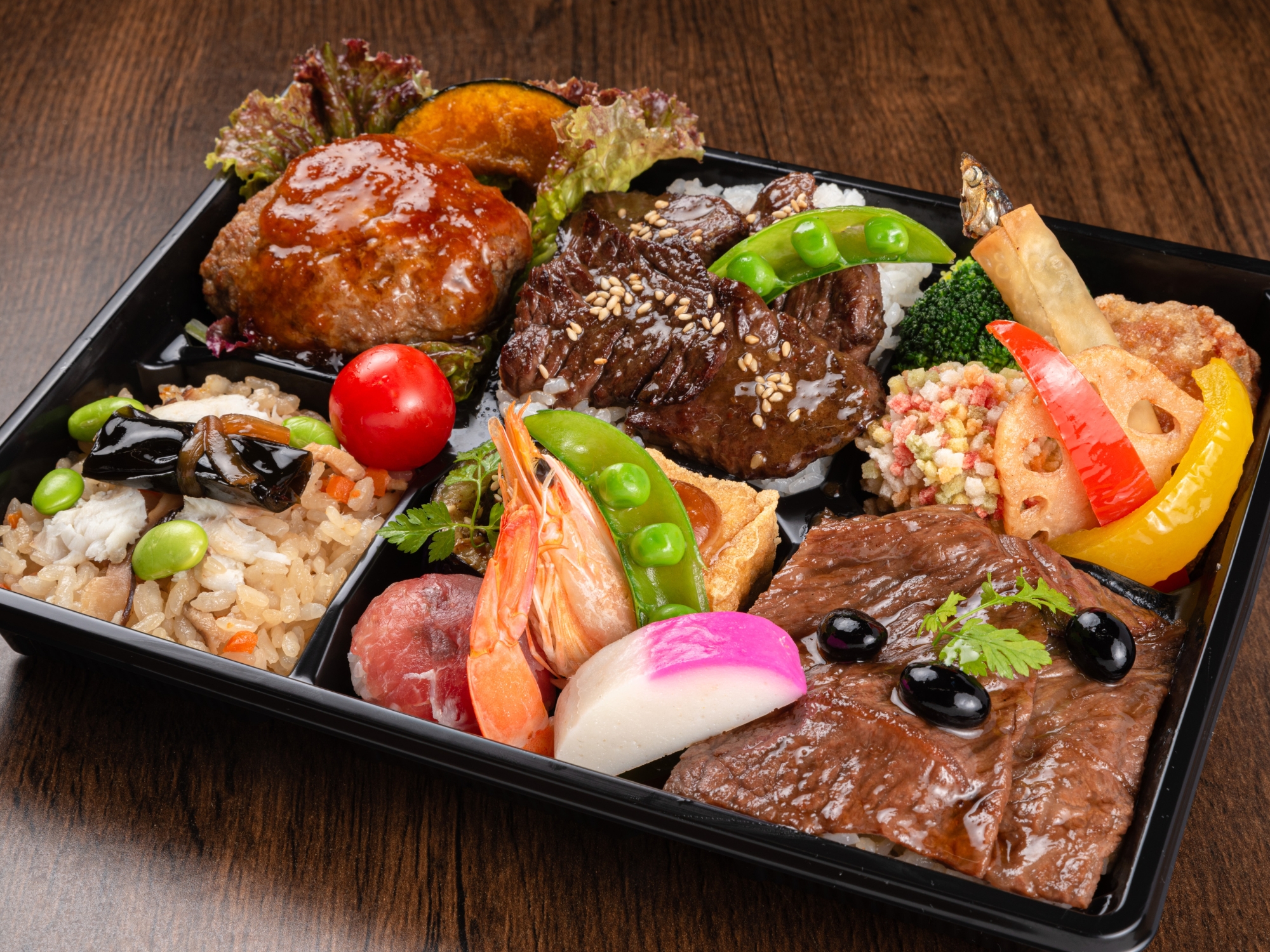 一品一品に込めた和の趣と匠の心。鮑の旨煮、黒毛和牛ステーキ、黒毛和牛すき焼き飯、ロブスターの琥珀焼きなど、厳選食材を丹念に仕立てた珠玉の御膳です。華やぎと品格を併せ持つこのひと折りは、大切な方へのおもてなしや、特別な日のひと時を格別まものへと導きます