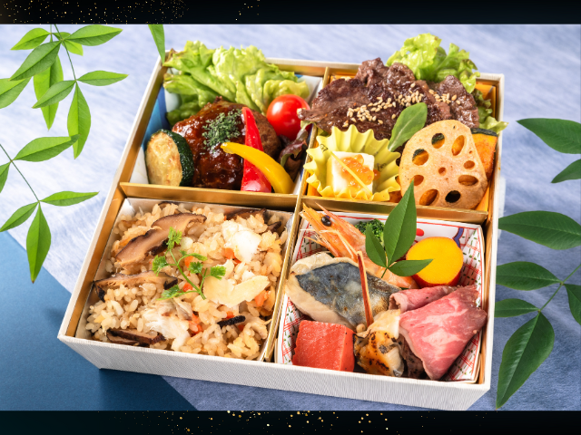 一品一品に込めた和の趣と匠の心。鮑の旨煮、黒毛和牛ステーキ、黒毛和牛すき焼き飯、ロブスターの琥珀焼きなど、厳選食材を丹念に仕立てた珠玉の御膳です。華やぎと品格を併せ持つこのひと折りは、大切な方へのおもてなしや、特別な日のひと時を格別まものへと導きます。
