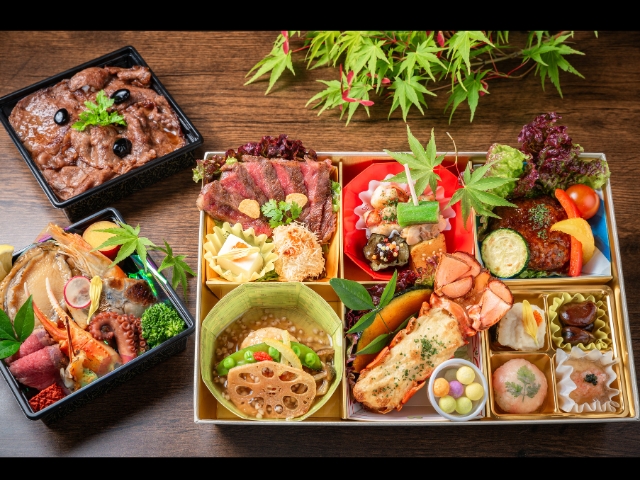 一品一品に込めた和の趣と匠の心。鮑の旨煮、黒毛和牛ステーキ、黒毛和牛すき焼き飯、ロブスターの琥珀焼きなど、厳選食材を丹念に仕立てた珠玉の御膳です。華やぎと品格を併せ持つこのひと折りは、大切な方へのおもてなしや、特別な日のひと時を格別まものへと導きます。